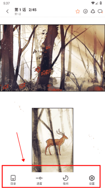 在阅读页,提供目录、进度、夜间、设置等功能;