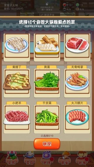 开局推荐玩家选择程序员喜欢吃的10道菜,分别是黄喉、藕片、鹅肠、脑花、平菇,还有土豆片、冬瓜片、金针菇、极品毛肚、现切牛肉。所有的不一样会+5流量、一样的话+10流量,在游戏中流量是非常重要的,火锅店主要就是流量赚钱。
