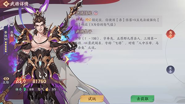 4、吕布,1500的将魂武将,慢慢攒,排在司马之后,推荐第二个或者第三个买。基本符石:哀兵/迅奋/刚勇,迎击。