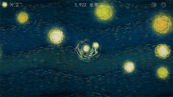 我们相距十万光年官方正版是一款极富诗意的休闲类独立手游,游戏的画风取材梵高的作品《星夜》,画面主要由宇宙填满,天空中的星星巨大而明亮,而云彩也随着星光卷曲成一团,画面右上角的巨大月牙金黄耀眼一这些抽象的"圆圈”使得天空显得充满神秘感。BGM寂静空灵,相当致郁。