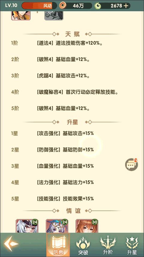 除了这些点外,角色还可以通过升星、提升天赋阶阶来提高的自己的实力,提升这些也能获得一定的属性加成。大家前期的主要工作也就是尽可能快的提升自己的角色星级、品质、以及天赋阶层让自己的角色的战斗力能够应付现阶段的战斗。