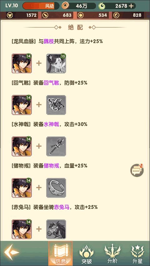 在刚进游戏后,我们大家是了解到我们主角是拥有万中无一的神龙血脉,而我们帮助过的魏枝小姐姐是凤凰血脉,这种羁绊就可以让他们成为最佳拍档,2人共同上阵就获得属性的加成。当然除了角色之外,角色如果使用趁手的武器装备也可以获得额外的属性加成,正如小编图上所示。所以大家最好是根据自己的角色搭配为案本,来进行配队,这样就可以起到事半功倍的效果了。