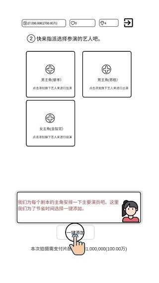 8、影片名称确定好之后,接着就是为剧本的主角分配艺人,为了节省时间,玩家可通过“一键添加”进行设置。