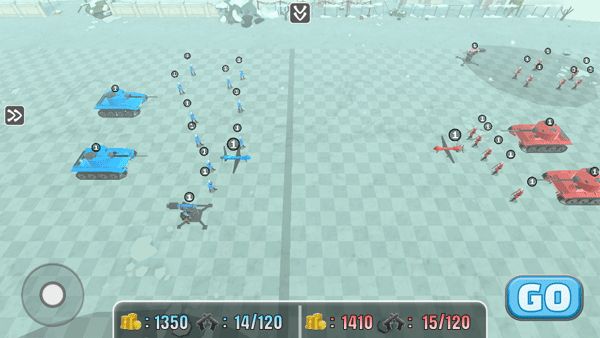4、调整了战役的环境,就可以根据左上角一系列的英文来添加士兵、武器等。添加完后就可以点击右下角的“GO”,让红队和蓝队开始打战。
