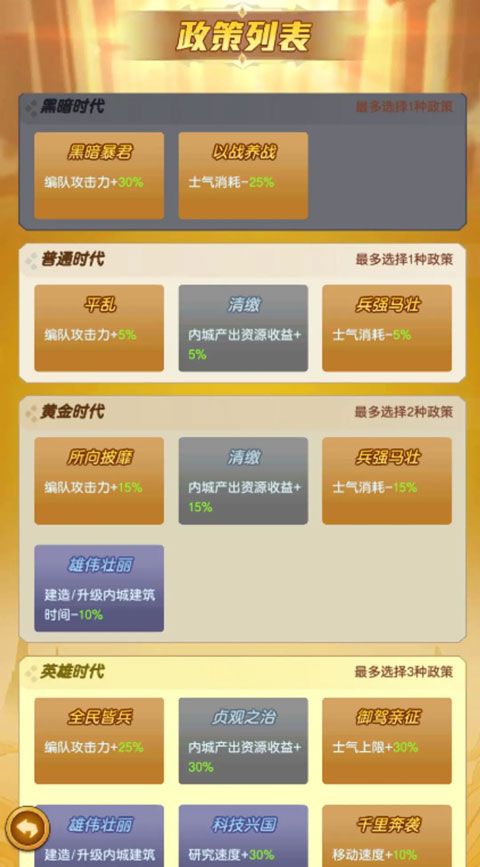 英雄时代政策:全民皆兵、贞观之治、御驾亲征、雄伟壮丽、科技兴国、千里奔袭(最多可以选择3种政策)
