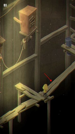 1、游戏的开始就是摩诺用门抵挡外面的攻击,第一关,摩诺在一个类似篮子的地方,需要按住上面的拉杆让自己落到地面上。