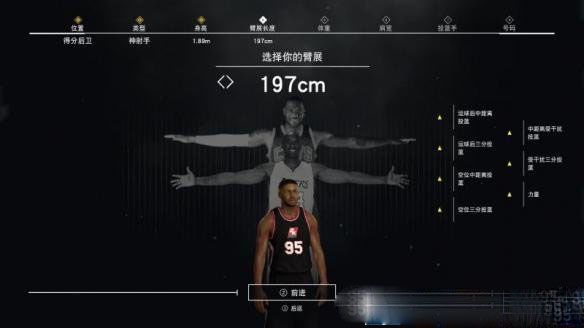 选择体格:体格有身高、体重、臂展。根据球员位置来决定身高和体重,控卫和得分后卫身高的偏矮,可以选择身高在175cm至188cm之间,而大前锋、中锋和小前锋身高最好在185cm以上。