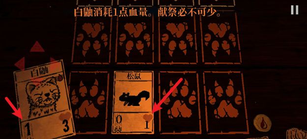 2、不同的卡牌有着不一样的打出条件,例如白鼬就需要献祭一点血量才能打出。