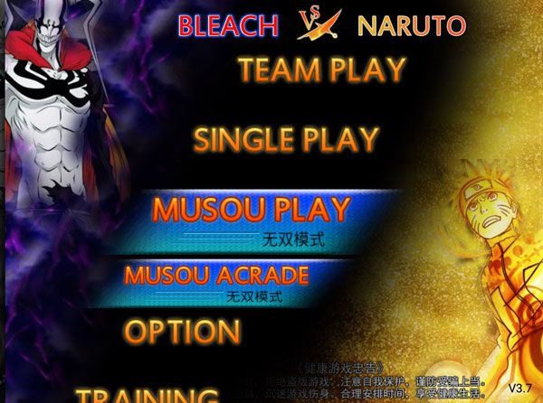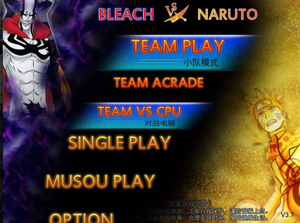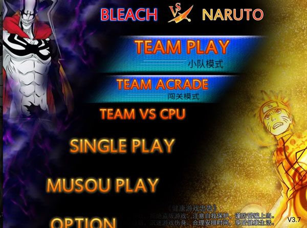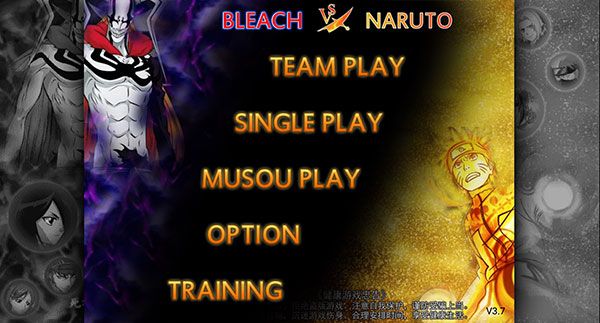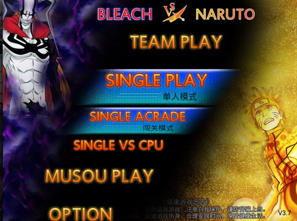 1、打开死神vs火影,进入选择玩法模式,小队模式TEAM PLAY、单人模式SINGLE PLAY、无双模式MUSOU PLAY。