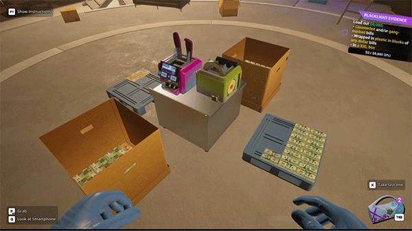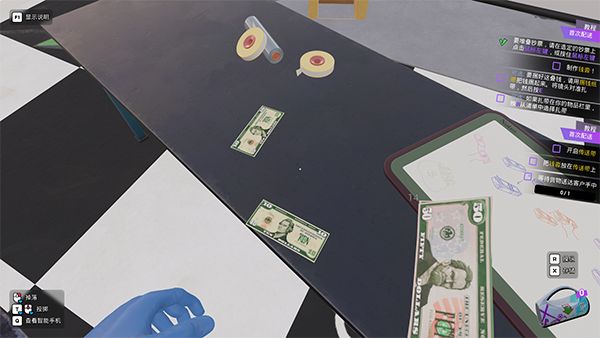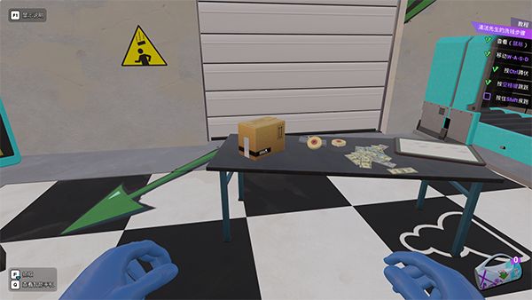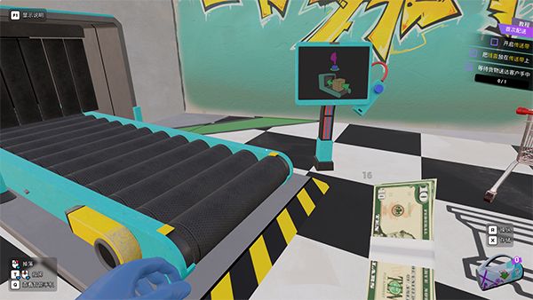 7、一开始玩家只需要对着货币按着鼠标左键,接着在胶带按E,之后放进箱子里即可。