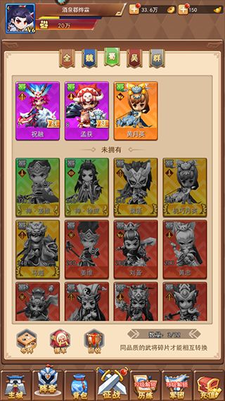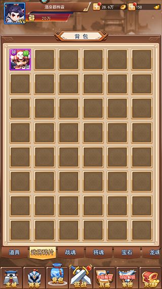 3、然后就是背包,背包中可以用来存放装备和武将的碎片还有一些用于升级的道具。背包存放有上限,各位小伙伴要记得及时清理噢,多余的装备可以回收为金币,溢出的武将碎片也可转化为别的武将碎片