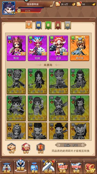 2、接下来是阵容,游戏中分为魏、蜀、吴、群等四个阵营,而武将的品质也有区别,按照高低品质来排的话,分别是神、黄、红、橙、紫,神级武将最为强力,但是获取也很困难
