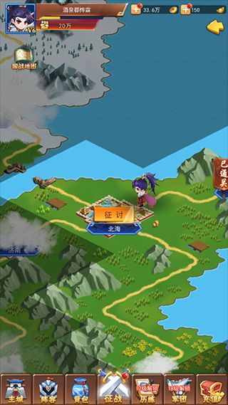 6、这里是征战的缩略地图,已经通关的地区会插上已通关的旗帜,被云遮罩的地区则需要通关前置地区才能进入挑战