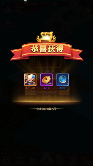 5、通关后可以获得奖励,平常关卡的话是随机掉落武将碎片,大量金币和升级装备用的武魂,BOSS关卡和限定活动关卡会掉落更稀有的奖励,可能还有限定的成就奖励以及称号