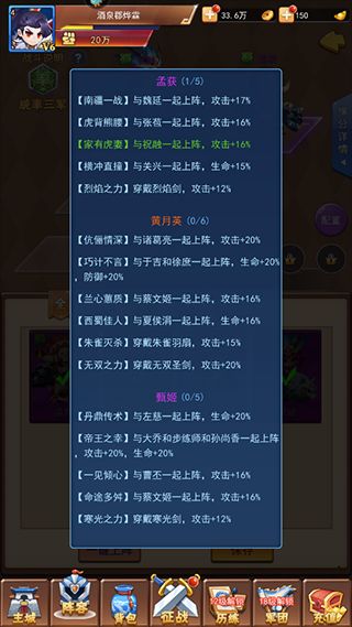 一统三国:上阵同国家的6名武将,全体上阵武将可获得强大的属性加成:生命+30%,攻击+20%,伤害减免+10%