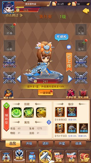 5、点击单个武将的头像可以进入查看该武将的具体情况,同时也可以进行进阶,装备武器等操作,还能换装噢~