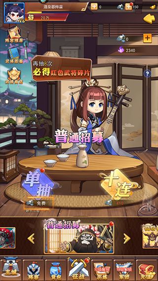 6、那么要如何获得这些武将呢?答案就是酒馆招募!玩家可以选择单抽或是十连抽。不必担心,小编亲测出货率挺高的,而且游戏设有人性的保底机制,绝不让你空手而归!