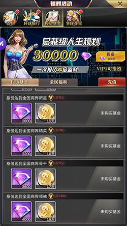 开局一张黄金月卡,橙人胖迪到手,可以领一个月的工资,还可以达到V3等级,投资基金,达到一定等级都可以领取基本回报,数量非常的可观。