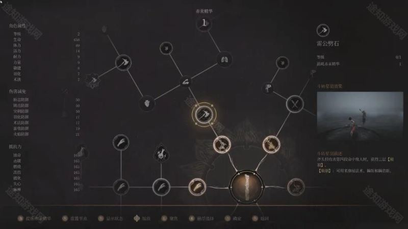 这也就意味着,前期的武器选择几乎决定了玩家的属性数值,也同样决定之后要走的流派。比如,斧头技能树的属性多是活力和耐力,提升血量和精力,而双手剑的属性多是羽化和法术,是法爷们的最爱。