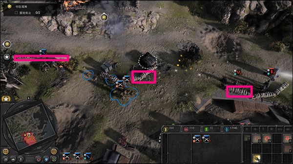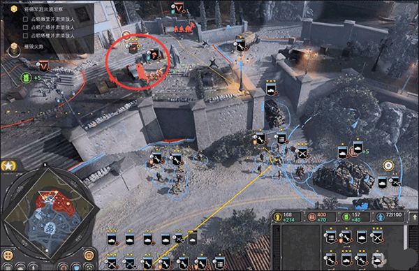 9、战场上的掩体非常重要,玩家可以巧妙的利用好这些掩体在部队稀少的情况下做出有力的反击,当选择部队后把鼠标移动到地图上红色方框内的区域后就会出现盾牌的小图标,这样的图标出现时就代表掩体非常安全;