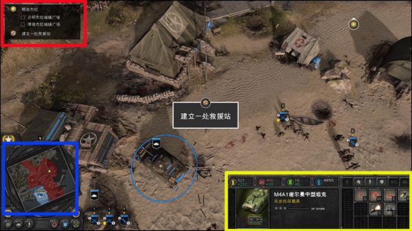 12、接下来的任务流程大家可以根据红色方框中的任务展示面板来做,在蓝色方框内显示的是小地图,可以帮助玩家很好的看清楚战斗的大概情况,当我们选择好载具、部队后就可以在黄色方框内查看它的具体信息了。