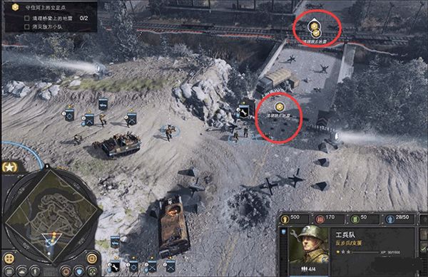 先占领据点,然后派工兵拆除桥两头的地雷,注意桥头有敌人,需派更多部队掩护工兵。