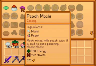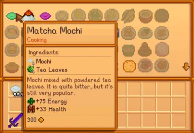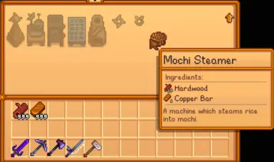 《星露谷物语》蒸汽麻糬MOD,新增了一台麻糬蒸器和各种麻糬。在农耕等级6解锁麻糬蒸锅,用15块硬木和1根铜棒制作。麻糬类型可以在农舍厨房里烹饪。感兴趣的小伙伴快来下载吧!