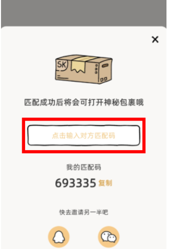 3、同样,也可以将自己的匹配码复制发送给对方,让对方进行匹配,还能通过qq和微信区邀请另一半。