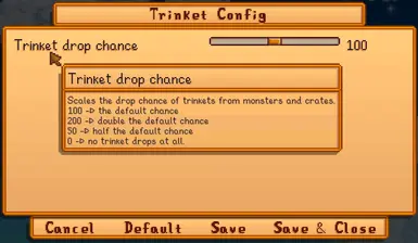 《星露谷物语》饰品掉落几率配置MOD,你有没有觉得自己拿齐了所有饰品,但每次击杀怪物或砸箱子时,它们反而堆满了你的背包?或者当有些模组(比如使用TrinketTinker框架的)给玩家一个早期饰品槽,结果游戏太早就拿到饰品时,怎么办?没关系!只要把这个配置设为“0”,你就不会有任何数据,或者把它调低一点,这样掉的就更少。感兴趣的小伙伴快来下载吧!