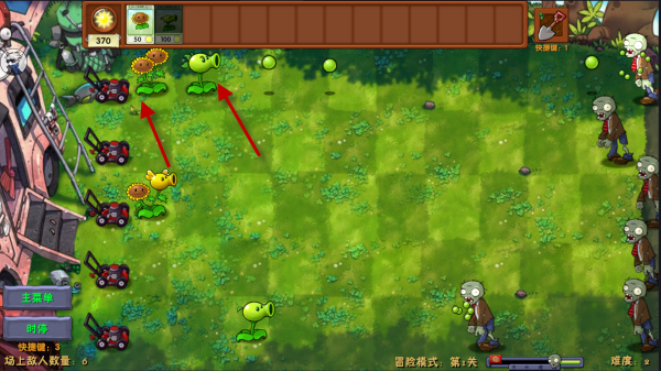 2、接着继续在太阳花上种植豌豆射手,这样就会得到一个既能生产阳光,又能发射豌豆的融合植物了。