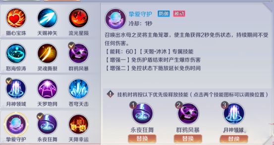 月神领域可以固定不变,后面两组技能在打斗过程中切换,至于什么时候换技能,也挺简单,进去直接切换技能页面,打开声音,天姬放技能时会喊技能名,技能名喊完直接换下一个技能就行。