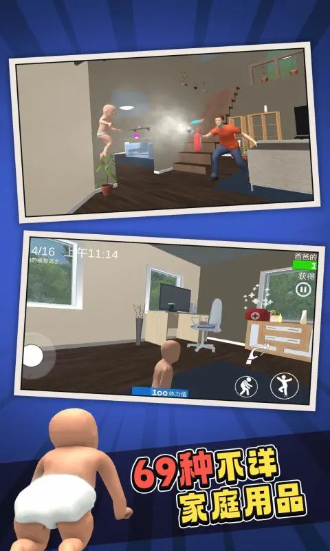 谁是你爸爸这是一款有趣而休闲的益智手机游戏,玩家可以扮演两个角色:父亲和儿子。当你扮演父亲的角色时,你的任务是防止你的儿子因任何情况而死亡,而当你扮演儿子的角色时你的任务就是自杀。同时,儿子自杀的方式有很多,比如喝厕所清洁剂、吞下电池、吃垃圾、爬进电炉蒸自己、淹死在浴缸里、把金属叉放进插座触电等。父亲必须尽其所能防止儿子自杀,比如用胶带封住插座、给孩子喂药、用危险品锁橱柜门、关掉电炉、从儿子手中拿走危险品等。