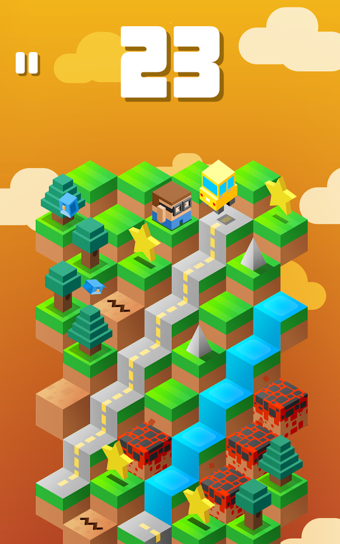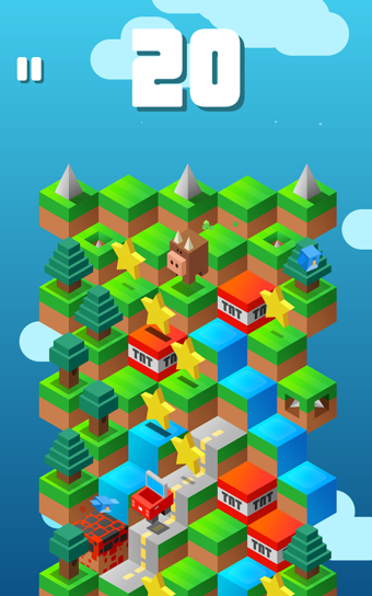 《小猪下山app Down the Mountain》有一点像把《Crossy Road》中类似《青蛙过街》的部分抽掉,换成《Qbert》。基本上,你要一个方块一个方块地跳下一座山,闪躲路上的陷阱与笨笨的动物。