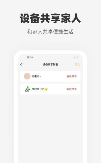 3、设备共享全家方便分享设备给家人和朋友,为你打造精彩的智慧生活家。