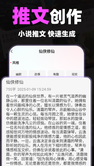 2、小说推文神器APP支持多种写作风格选择,满足民间故事、电影解说等不同读者的阅读偏好。