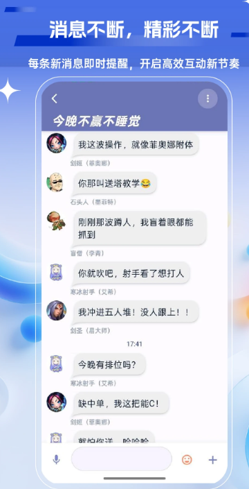 所有的聊天沟通信息都是实时传输和推送的,用户可以立即获得新的消息。