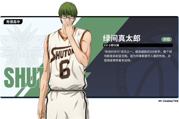 海常高中的首发球员。在个性派聚集的海常里虽没有出彩表现,但凭借稳健的防守能力守住了篮板。
