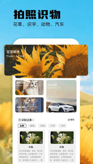 1、打开app体验拍照识物,花草树木、动物、汽车、文字都能精准的识别;