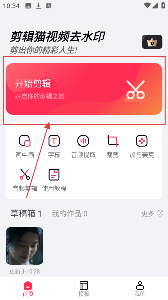 1、想开始视频剪辑的话,点击【开始剪辑】按钮,就能开启剪辑啦。