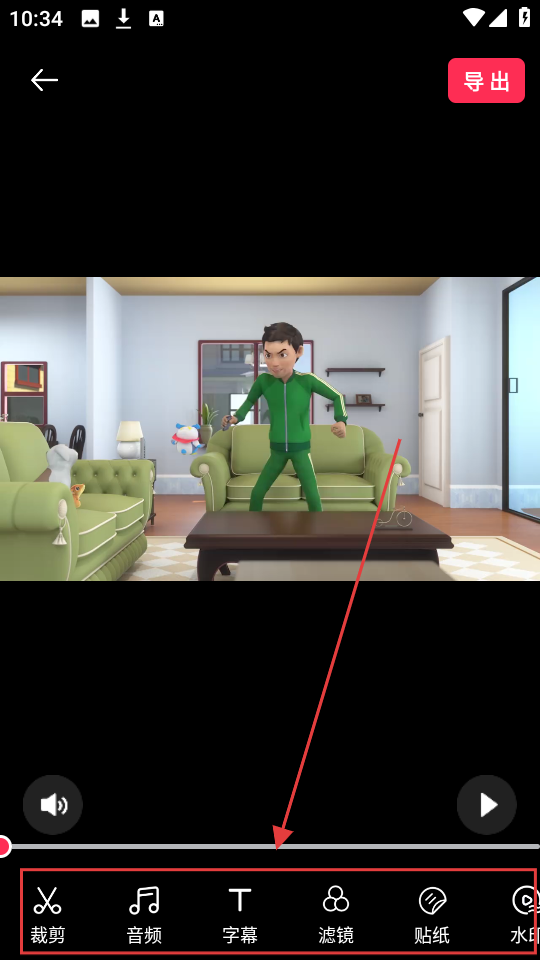 2、进入剪辑界面后,下方有裁剪、音频等功能按钮,根据需要点击相应按钮来编辑视频吧。