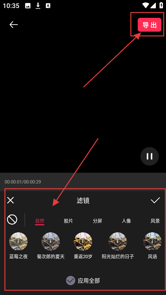 4、视频编辑好后,还能添加滤镜,选好喜欢的滤镜效果,最后点击【导出】,就能保存剪辑好的视频啦。